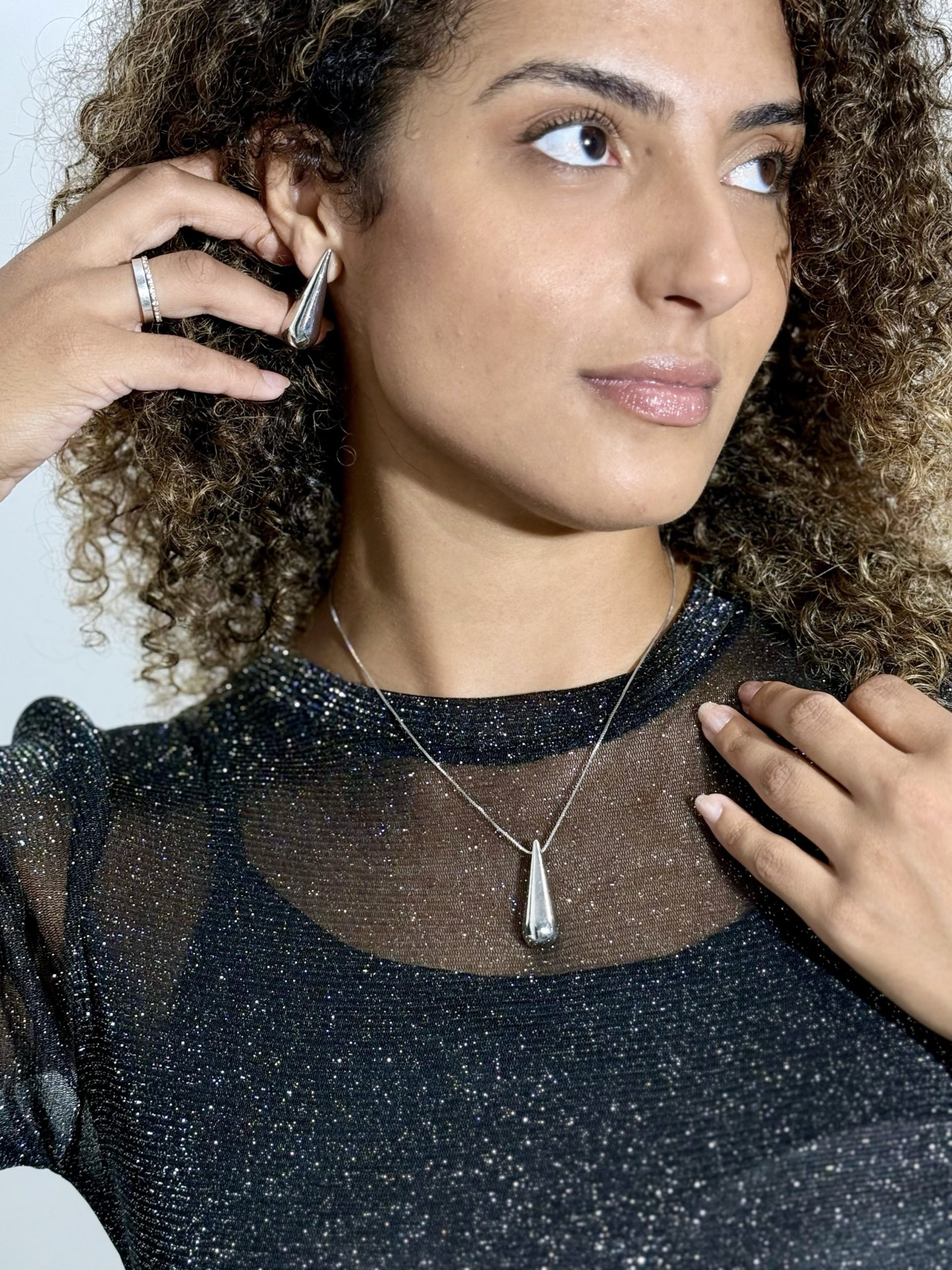Ambas as peças possuem um acabamento prateado brilhante, adicionando um toque de sofisticação a qualquer look.